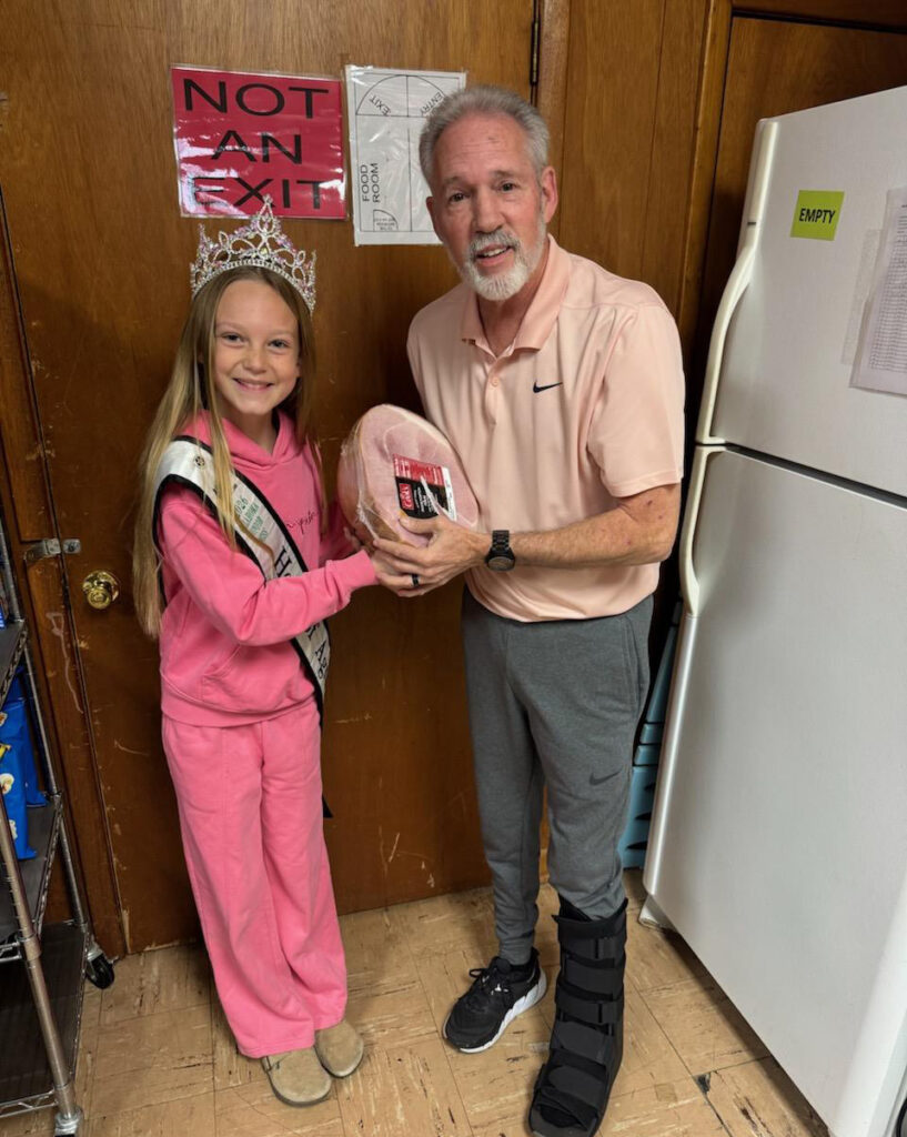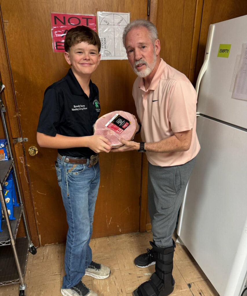 Racie Burns (Oklahoma Miss Heart of Agriculture) and Rowdy Burns (the Cotton County 4-H Healthy Living officer) donated hams as part of the Oklahoma Pork Council #giveaham challenge. Thank you to these two great kids for their wonderful donation and Pastor Paul for always lending a hand at the Walters Food Bank!