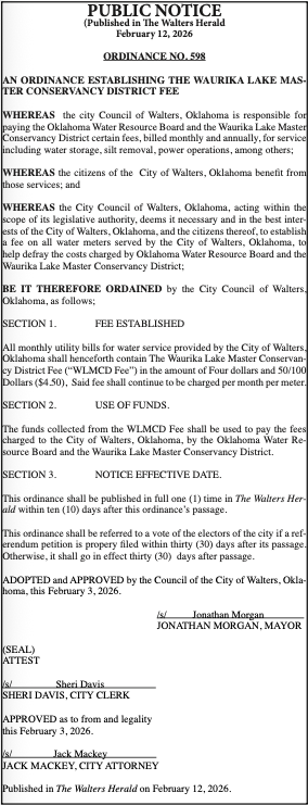ADOPTED AND APPROVED by the City of Walters, Oklahoma, this February 3, 2026.