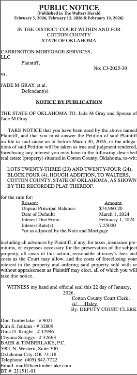 TAKE NOTICE that you have been sued by the above named Plaintiff, and that you must answer the Petition of said Plaintiff on file in said cause on or before March 30, 2026, or the allegations of said Petition will be taken as true and judgment rendered, foreclosing any interest you may have in the following-described real estate (property) situated in Cotton County, Oklahoma, to-wit: