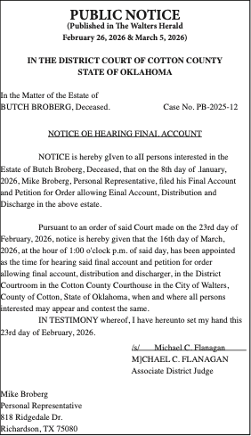 Pursuant to an order of said Court made on the 23rd day of February, 2026, notice is hereby given that the 16th day of March, 2026, at the hour of 1:00 o’clock p.m. of said day, has been appointed as the time for hearing said final account and petition for order allowing final account, distribution and discharge, in the District Courtroom in the Cotton County Courthouse in the City of Walters, County of Cotton, State of Oklahoma, when and where all persons interested may appear and contest the same.